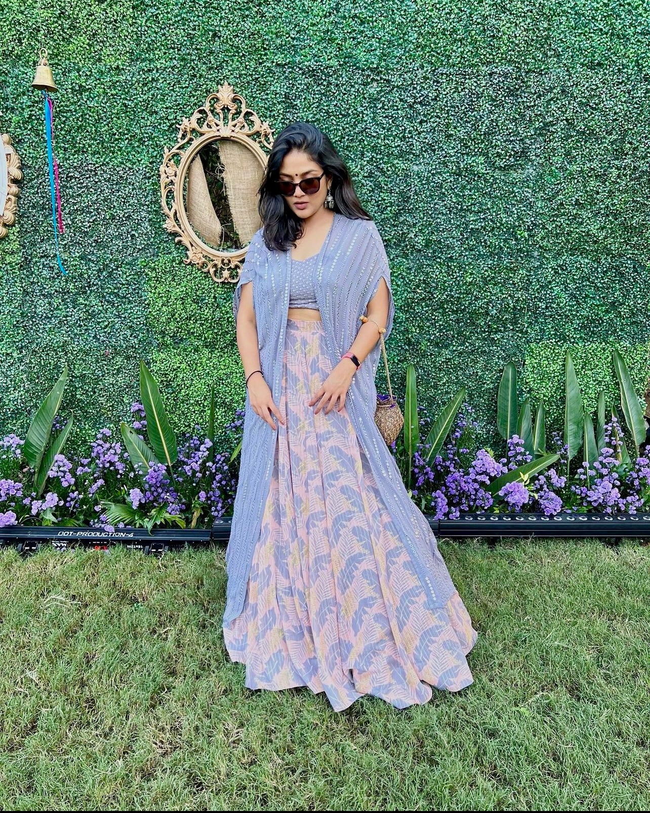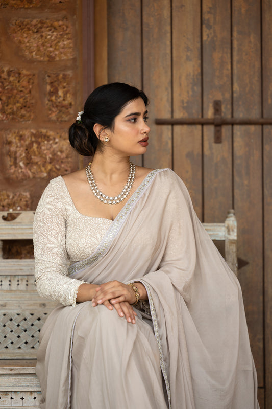 Chikankari jacket paired with chikankari blouse and crepe silk drape skirt