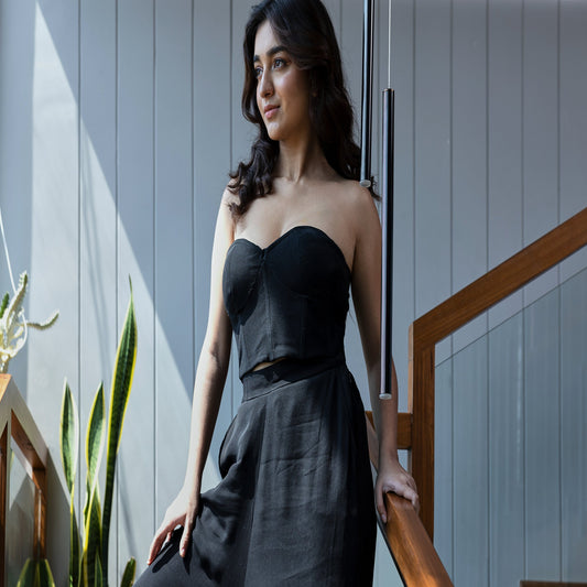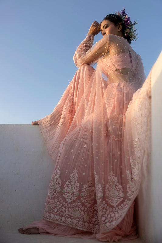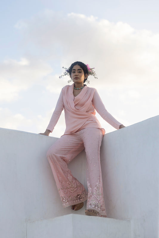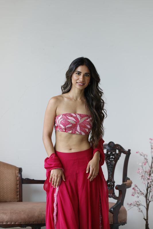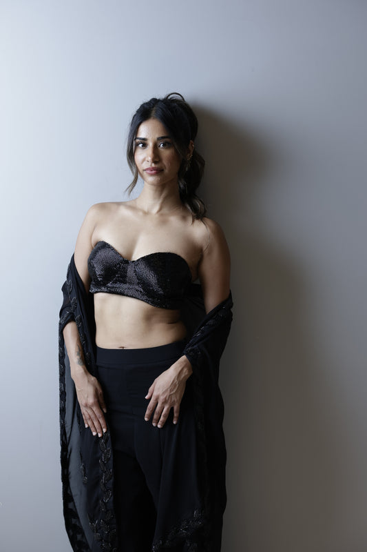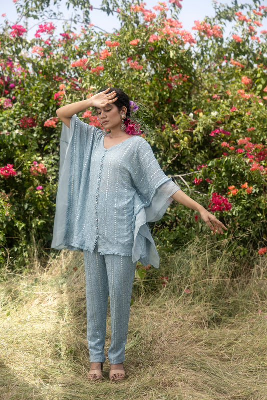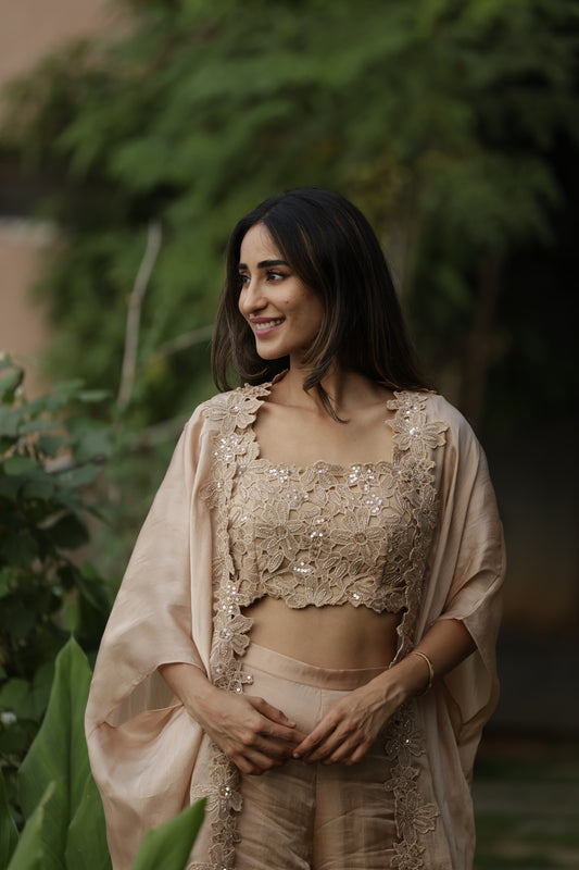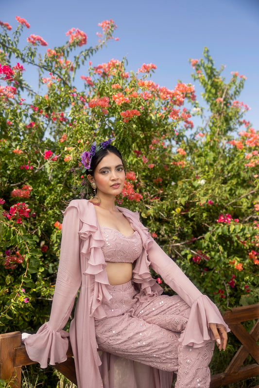 Ruffled chiffon jacket with mirror embroidered crop top and straight pants