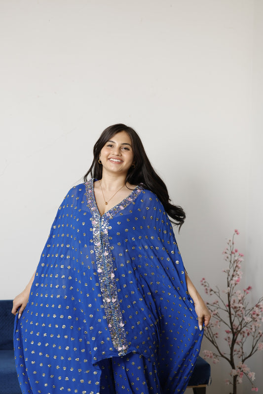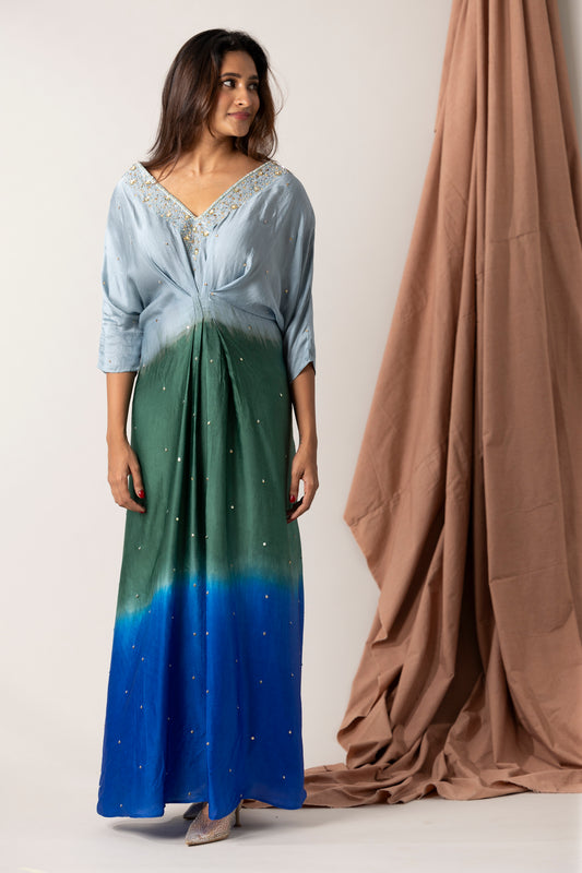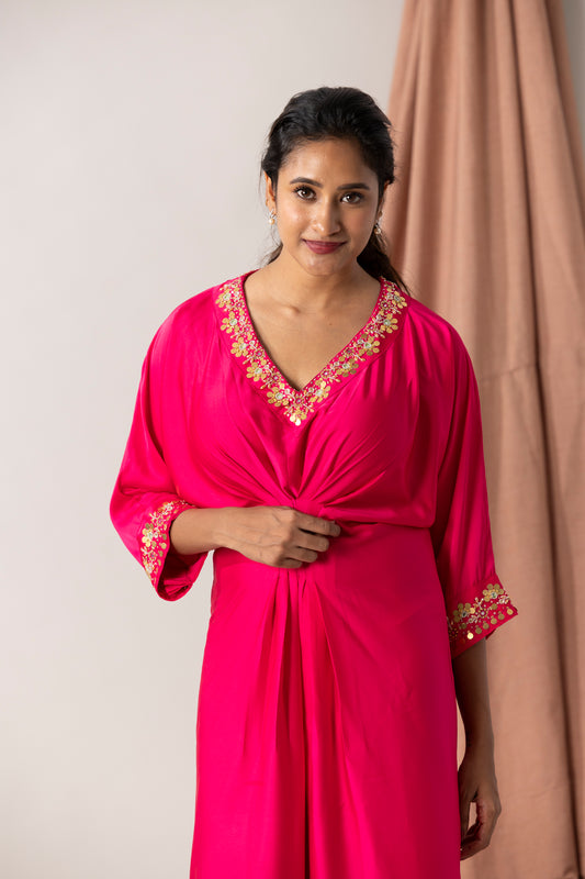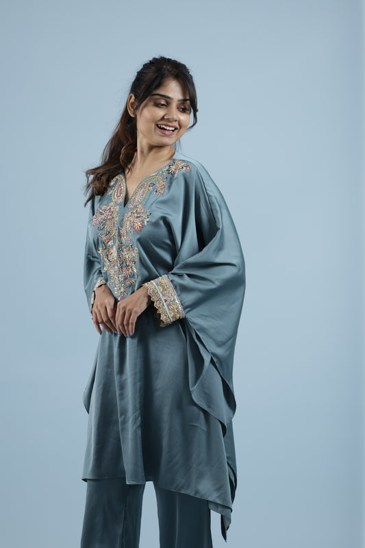 Armani silk satin kaftan with hand embroidered neck and sleeve ends