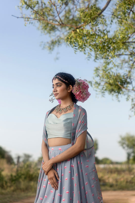 Ruffled chiffon jacket with mirror embroidered crop top and straight pants