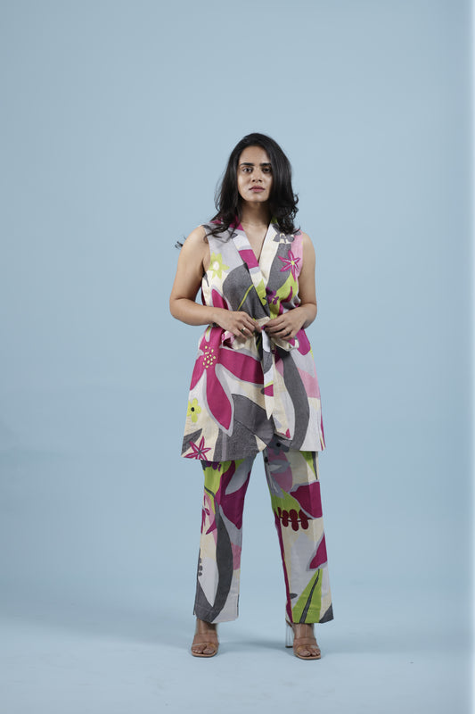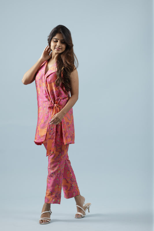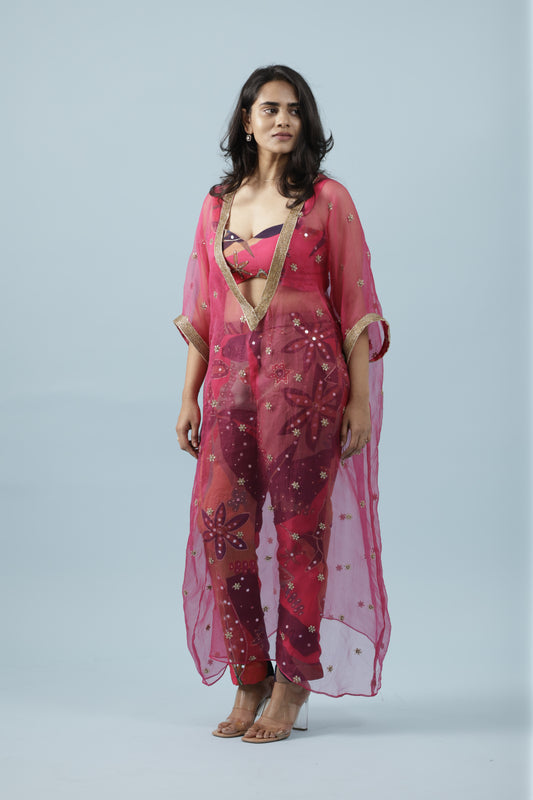 Pre draped saree with printed fabric ruffles and full sleeve blouse