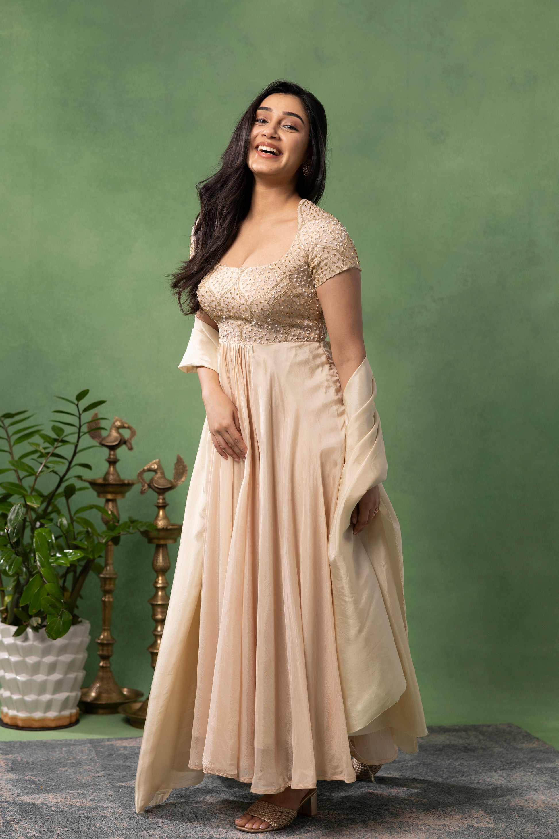 This ivory blush anarkali set is designed for effortless grace and refined festive dressing. The fitted bodice is delicately hand-embroidered with subtle bead and zari detailing, creating a soft shimmer that enhances the silhouette without overpowering it.